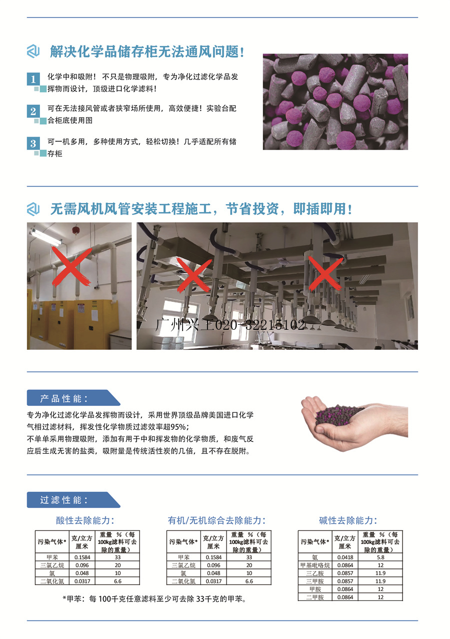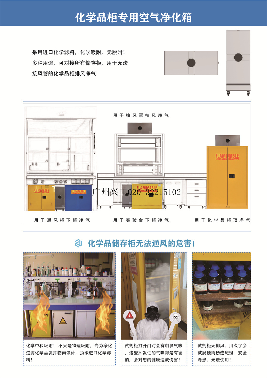 危化品柜专用空气净化箱也叫危化品柜专用空气净化箱,化学试剂柜争化箱,危化品安全柜套净化箱;是专为净化过滤化学品发挥物而设计,采用顶级进口化学滤料,挥发性化学物质过滤效率超95%,不单单采用物理吸附,添加有用于中和挥发物的化学物质,和废气反应后生成无害的盐类,吸附量是传统活性炭的几倍,且不存在脱附。净化您的危化品储存柜内的挥发性物质,防止有害气体集聚,避免有害气体伤害使用人员健康,以及因有害气体集聚而产生的爆炸等其他危险;