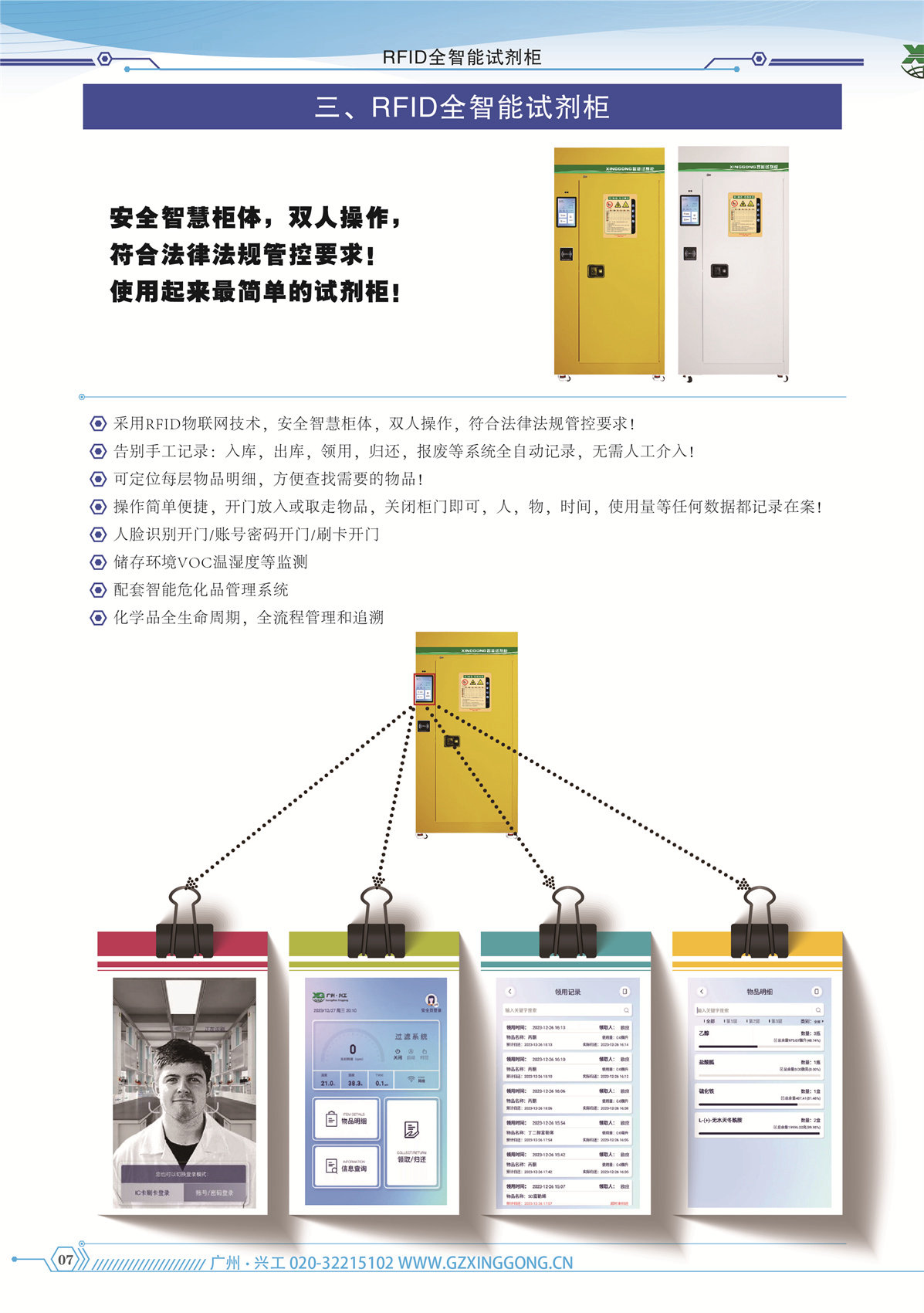 物联网全智能危化品柜又叫智能危化品管理柜,危化品智能管理柜,智能化学品柜,智能试剂柜,RFID智能危化品柜等等,是采用RFID物联网技术,结合危化品安全管理法律法规要求,用危化品安全储存柜的生产制造理念设计和生产的一款危化品智能管理安全储存柜;它不但可以安全储存危化品,也可以实现全智能化的危化品相关的物品,人,量,时间,环境等信息的全记录和可追溯功能;是一款安全,智慧,高效,便捷的危化品安全储存产品;